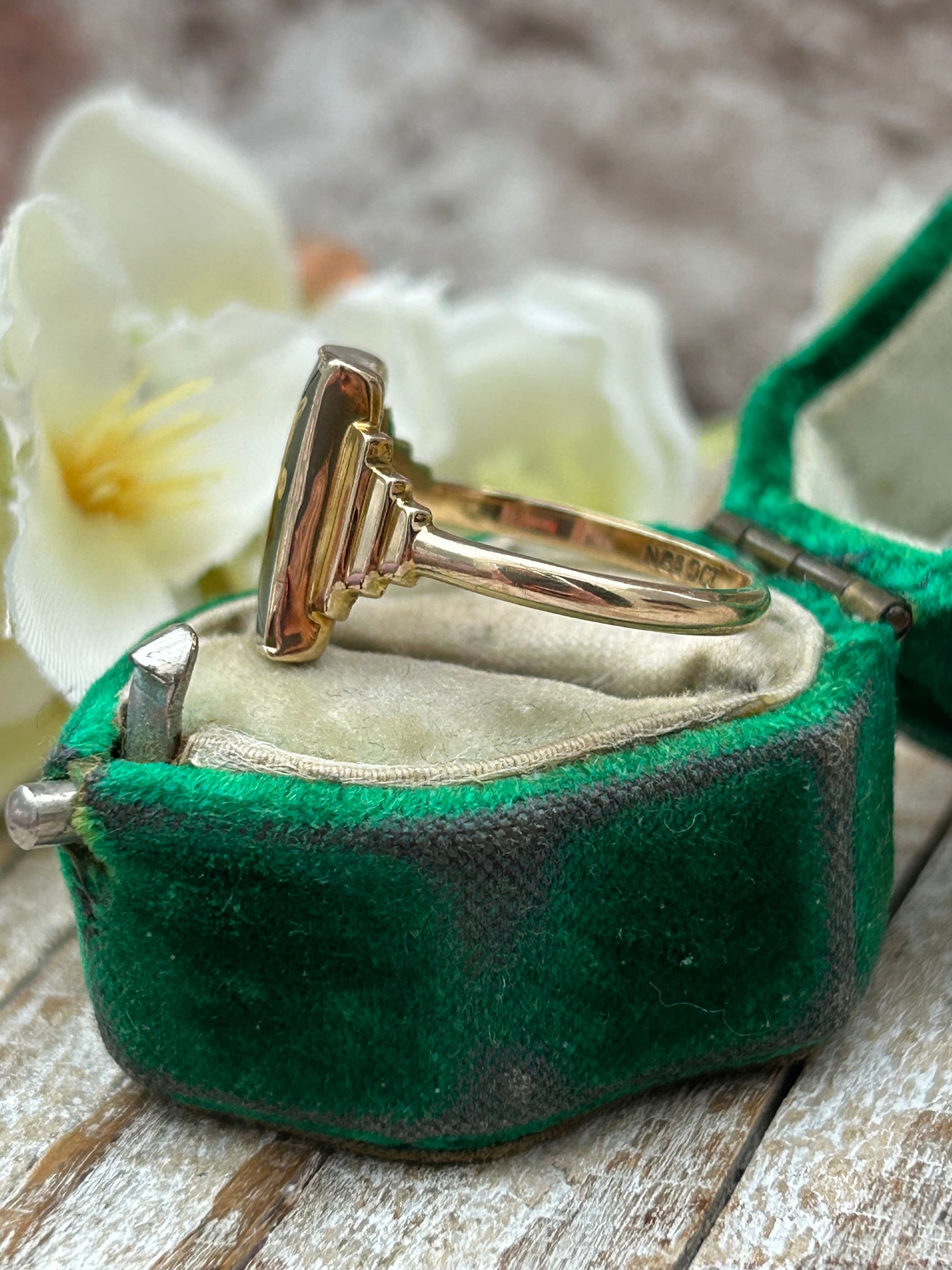 A beautiful antique Art Deco black enamel monogram signet ring crafted in 9 carat yellow gold circa 1930s. The head of this statement ring is rectangular in shape and features a sleek black enamel panel which serves as the canvas for the intricate gold Art Deco letter "F", serving as both a personalised monogram and a nod to the era's penchant for stylized motifs. The contrasting colours of the black enamel and the gold letter creates a striking visual impact commanding attention with its understated yet powerful presence. The stepped shoulders further enhance the Art Deco aesthetic adding depth and dimension to its design. In very good antique condition with minimal light wear and 9ct stamp mark to inner shank . This wonderful ring not only captures the spirit of Art Deco design but also carries with it a sense of history and tradition making it a cherished piece for any antique jewellery lover's collection.