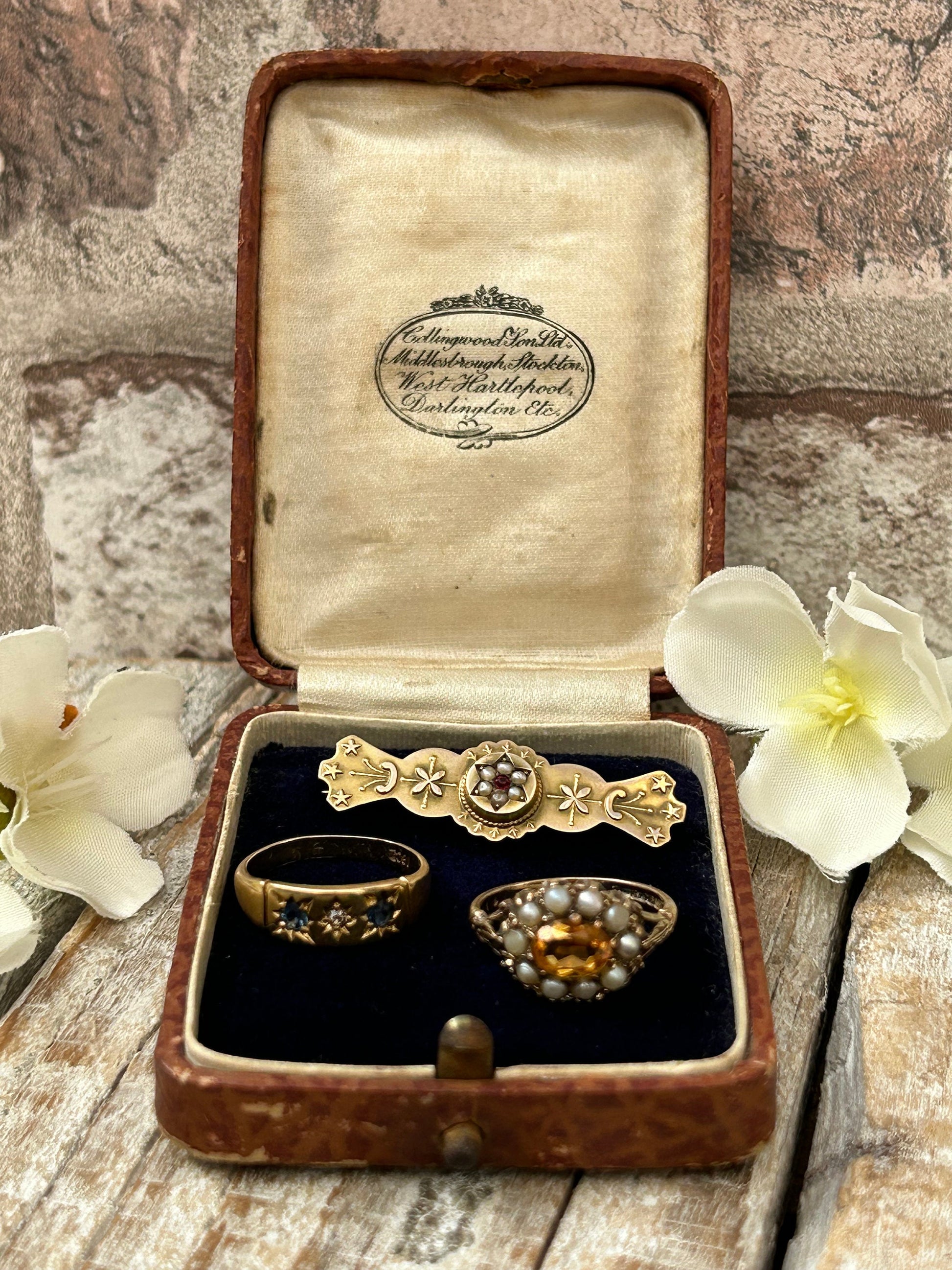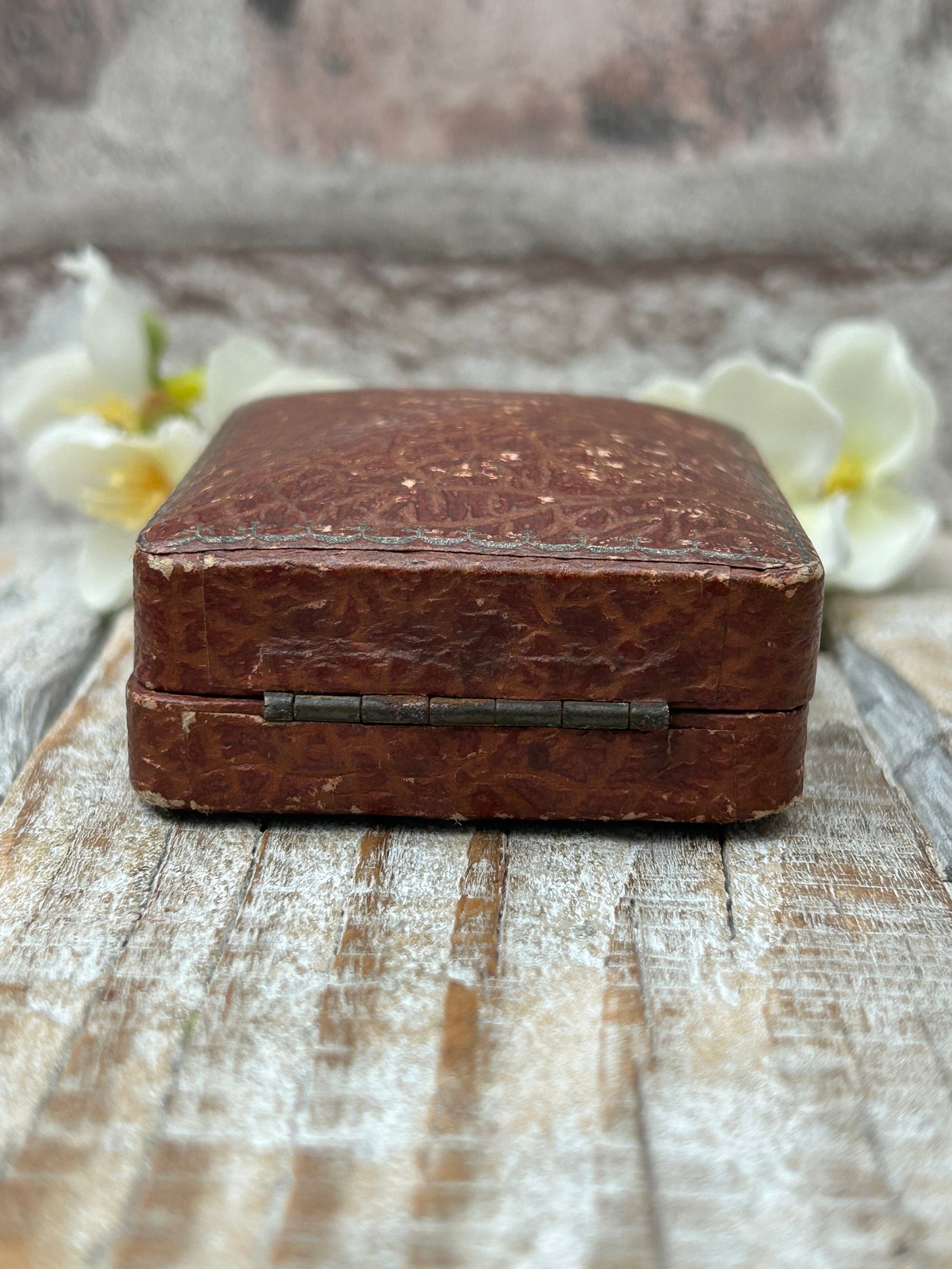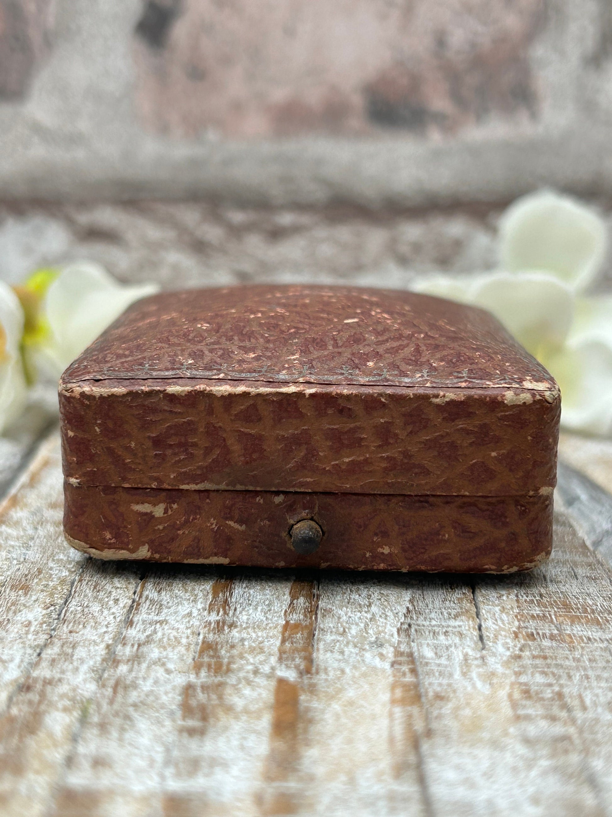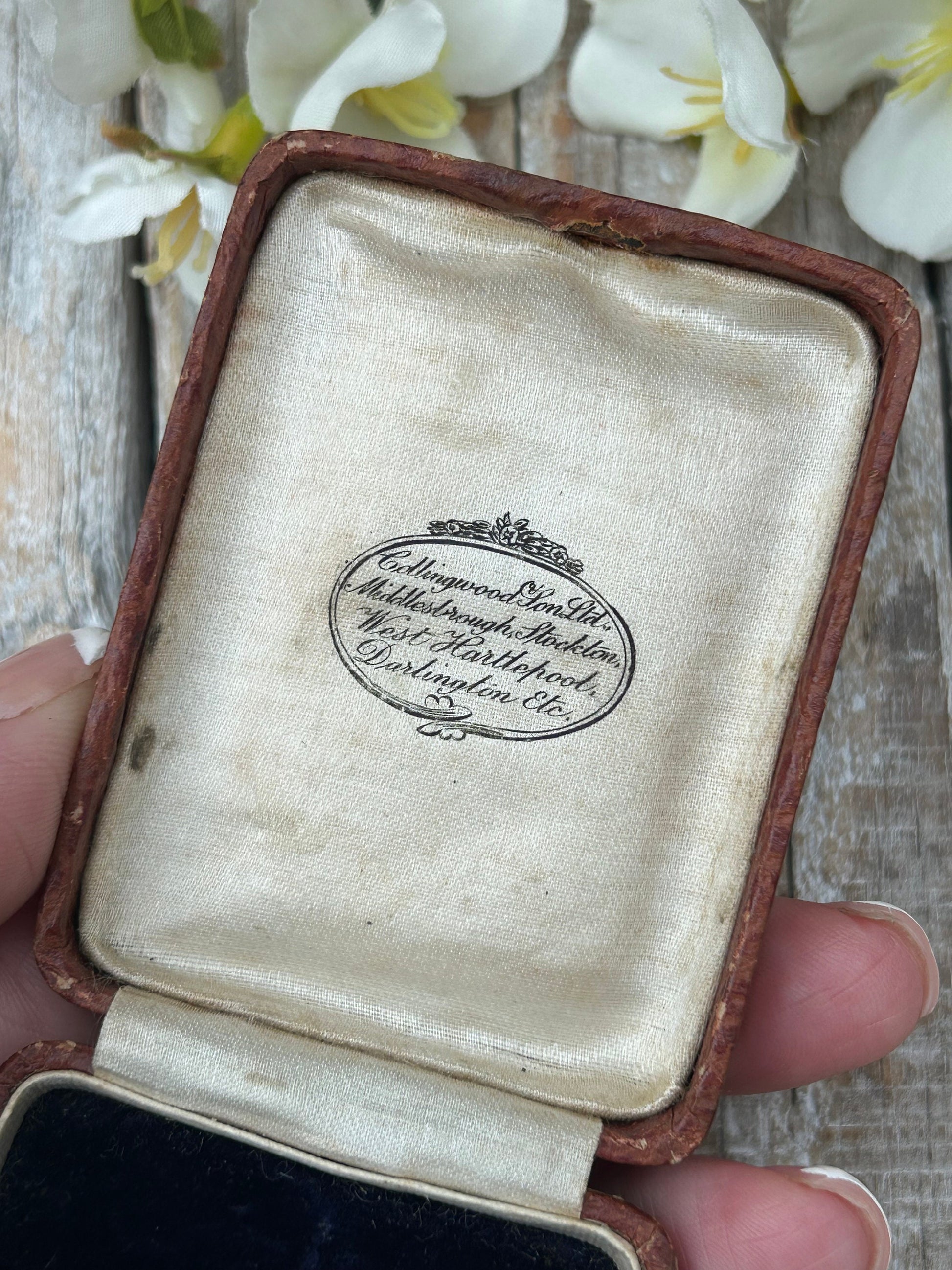 A beautiful antique jewellery presentation trinket box with a brown leather clad textured exterior circa early 1900s. It was retailed by Collingwood & Sons Ltd, Jewellers and Watchmakers with several retail outlets in the North East area of England. The box features a push button opening mechanism which snaps closed to keep the box secure with both catch and hinge in good working order. Inside there is a plush dark blue velvet lined base with the lid being lined with cream silk featuring black typography which reads: "Collingwood & Sons Ltd, Middlesborough, Stockton, West Hartlepool, Darlington, Etc". In very good condition with minimal light wear as per the photographs. A beautiful and unique box great for storing a pocket watch or your treasured jewels. It would also make a lovely shop display or photographic prop.