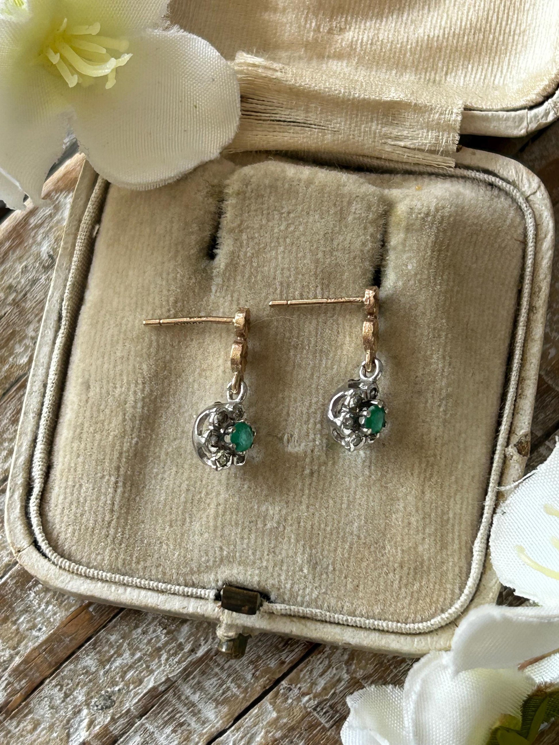 A stunning pair of vintage emerald and diamond daisy dangle earrings for pierced ears beautifully crafted in 9 carat gold. These elegant earrings showcase a timeless floral design with exquisite attention to detail. Each earring features a daisy shaped drop in white gold, centred around a lush green emerald gemstone that radiates natural beauty. The emeralds are surrounded by a halo of sparkling flush set diamonds, creating delicate petals that shimmer with every movement. The daisies gently dangle from two textured yellow gold discs adding warmth and contrast against the white gold and secure with butterfly push backs. In very good vintage condition and fully hallmarked to the ear posts for 9 carat gold. These gorgeous earrings are both eye catching and refined, perfect for special occasions or adding a touch of vintage charm to your everyday style.