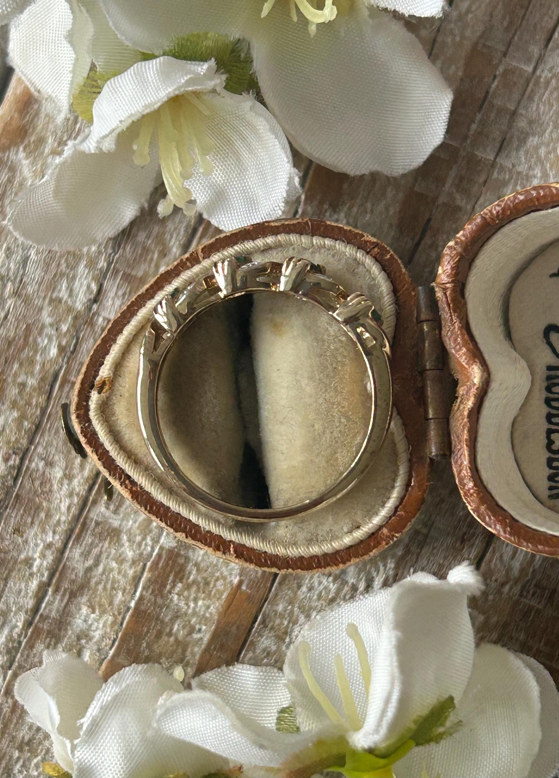 A beautiful vintage emerald and diamond eternity ring crafted in 9 carat yellow gold circa 1990s. This elegant ring features a graceful cross over design. Alternating round cut lush green emeralds are interspaced with a small sparkling diamond set in white gold, creating a subtle contrast that enhances the gemstones brilliance. Graceful and timeless, this ring symbolises everlasting love and would make a perfect anniversary, stacking, or right-hand ring. In good vintage condition with light wear consistent with age and 9ct gold and DIA (to signify the presence of diamonds) hallmark to inner band. Whether worn alone or paired with other pieces, it exudes charm and sophistication, making it a wonderful addition to any jewellery collection.
